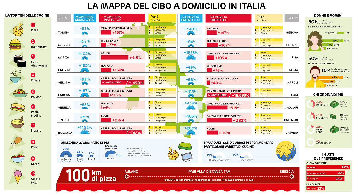 Difficile non aver mai almeno sentito parlare di Just Eat (qui il sito), il leader del mercato del cibo a domicilio presente in tantissimi esercizi del nostro Paese dal 2011. La novità è che recentemente il colosso della gastronomia ha pubblicato una cartina contenente informazioni sugli alimenti ordinati da casa in 18 città italiane. Informazioni di una certa rilevanza che servono a spiegarci quanto il food delivery stia incidendo in maniera profonda sulle preferenze e i giusti degli italiani.