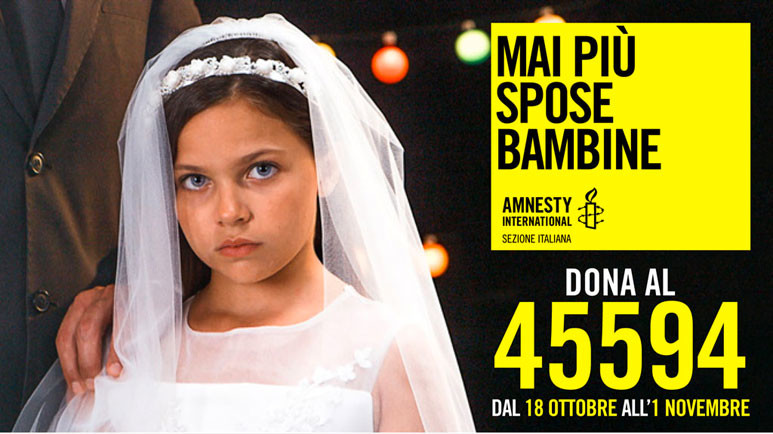 Per difendere e proteggere le bambine dai matrimoni forzati e da altre forme di violenza, fino al primo novembre, Amnesty International Italia, di cui quest’anno ricorre il 40° anniversario, lancia “Mai più spose bambine” campagna di sensibilizzazione e raccolta fondi tramite sms solidale al 45594.Pochi giorni fa gli attivisti di Amnesty International hanno simulato, nel centro di Roma, un matrimonio precoce e forzato tra una bambina di 10 anni di nome Giorgia e Paolo, un uomo di 47 anni. Una messa in scena per sollevare l’attenzione sul problema. Secondo le stime del Fondo delle Nazioni Unite per la popolazione (Unfpa) infatti 13.5 milioni di ragazze ogni anno nel mondo sono costrette a sposarsi prima dei 18 anni con uomini molto più vecchi di loro: 37 mila bambine ogni giorno alle quali, di fatto, viene negata l’infanzia.